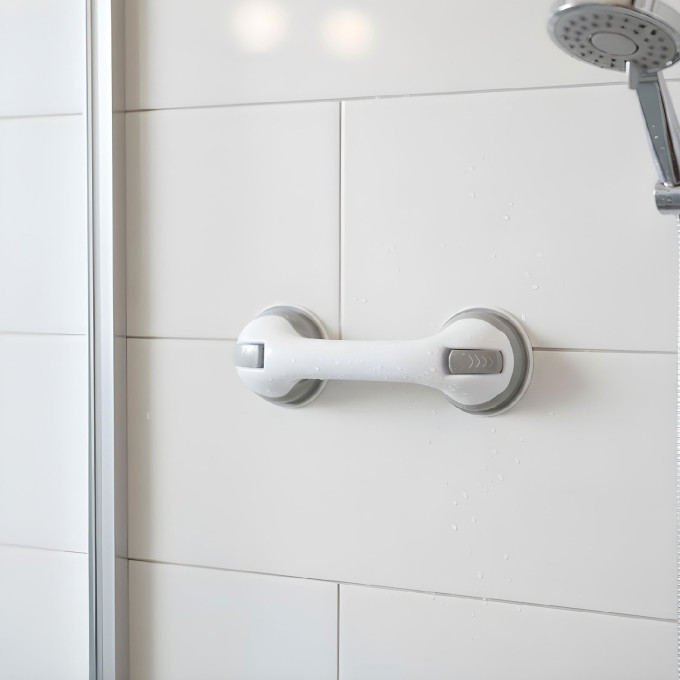 Mâner de siguranță baie cu ventuze puternice – soluția rapidă și sigură pentru băi alunecoase! Se montează în 10 secunde pe faianță, sticlă sau suprafețe netede fără găurit, fără șuruburi și fără urme. Ventuzele mari de 95 mm aderă perfect și suportă până la 50 kg – ideal pentru persoane în vârstă, copii sau după operații. Lungime 30 cm, design alb discret, perfect lângă cadă, duș sau WC. Recomandată de medici și fizioterapeuți – siguranță maximă în baie!