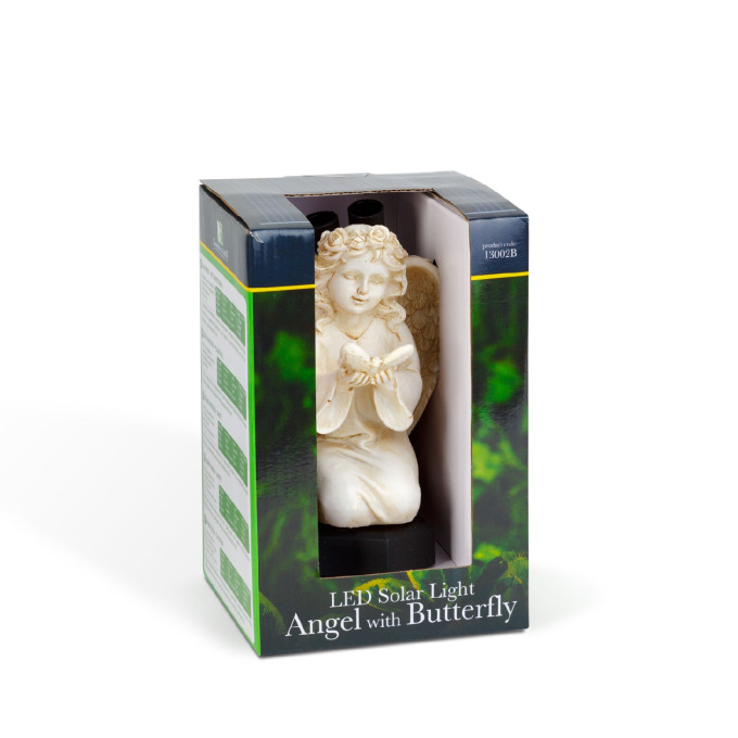 Decorul solar delicat și plin de magie! Îngerașul din rășină albă cu fluture în mână încarcă ziua energia solară și se aprinde automat la apus cu o lumină LED alb cald, blândă și relaxantă. Perfect pe mormânt, în grădină, pe balcon, terasă sau lângă alee – rezistent la ploaie, îngheț și soare. Include țeapă de fixare în pământ și baterie reîncărcabilă. Funcționează 6–8 ore pe noapte – fără cabluri, fără curent, doar lumină caldă și liniștitoare!